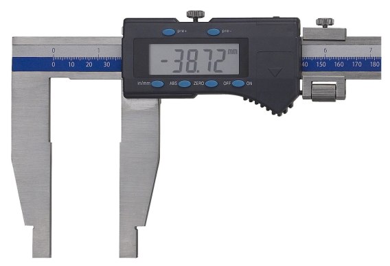 Suwmiarka cyfrowa. Ze stali nierdzewnej. Funkcja wartości Maks/Min. Funkcja HOLD. Wybór wskazania w mm lub calach. Nastawianie wartości odniesienia. Śruba dokładnego nastawiania. DIN 862. W załączeniu bateria typu CR2032.